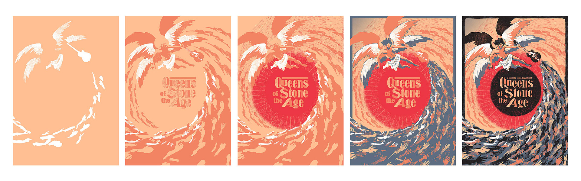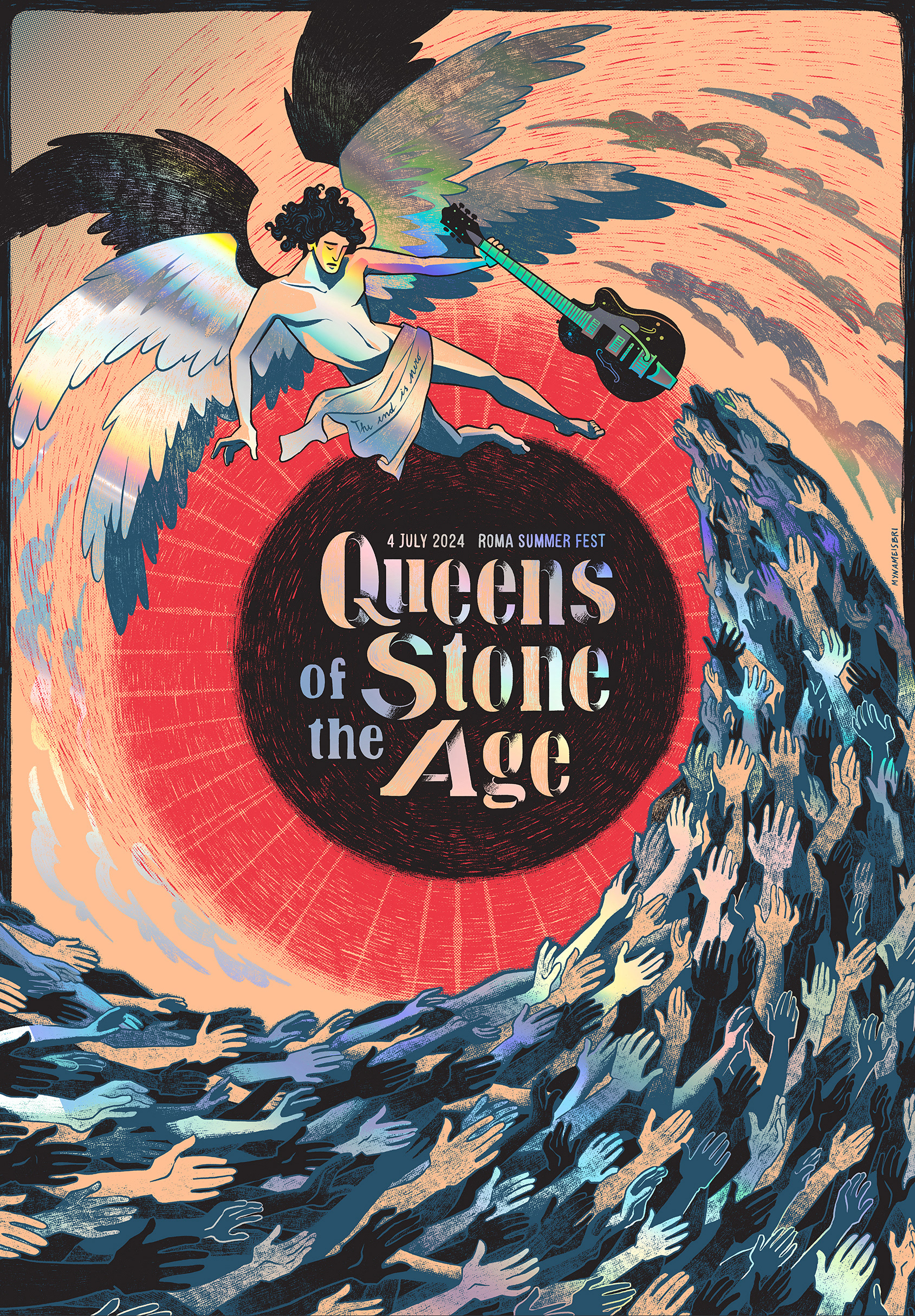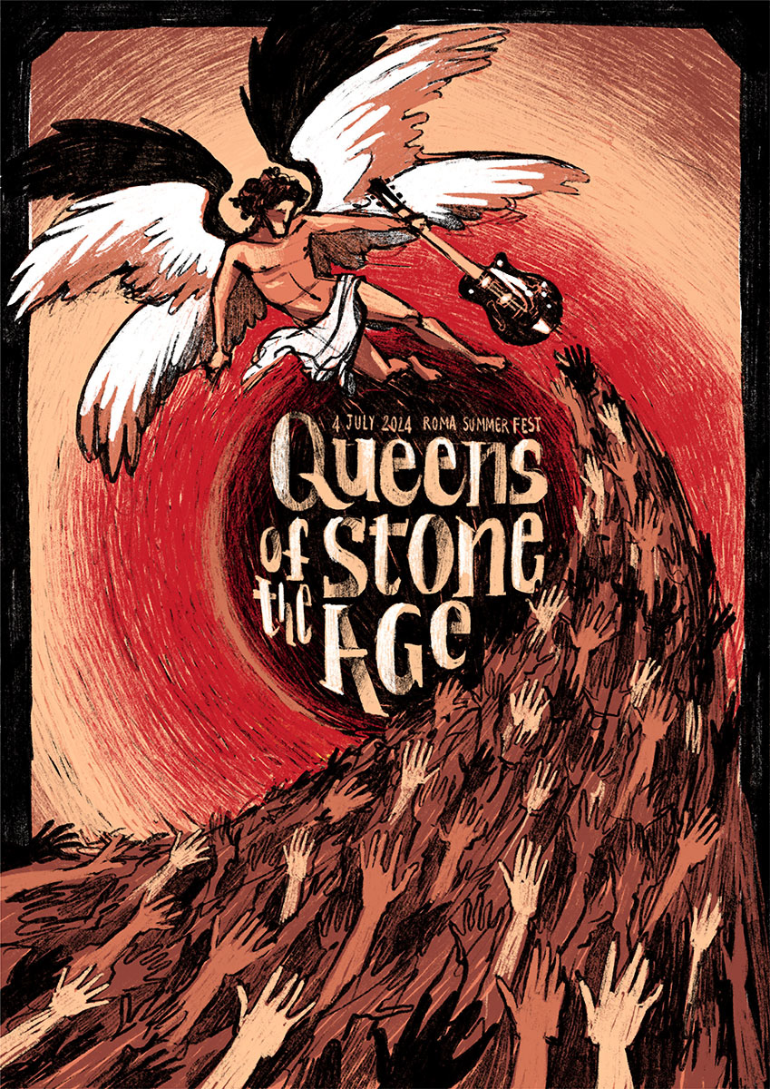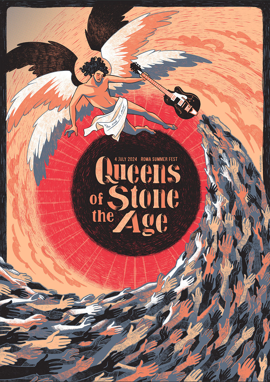 Official gig poster for Queens of the Stone Age, live in Roma 2024.